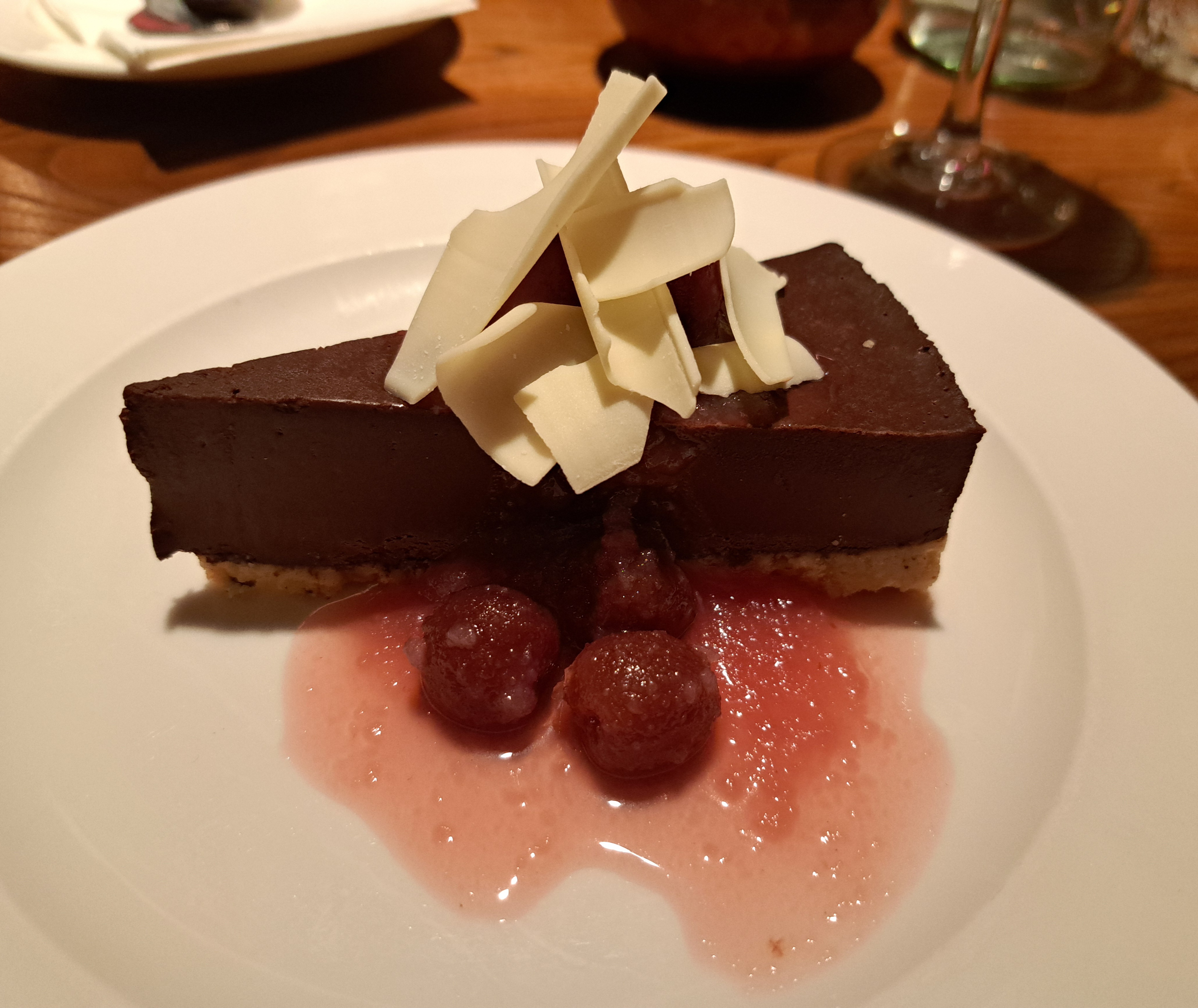 Truffle cheesecake topped with white chocolate shavings and a couple of soft cherries. What a delightful dessert.