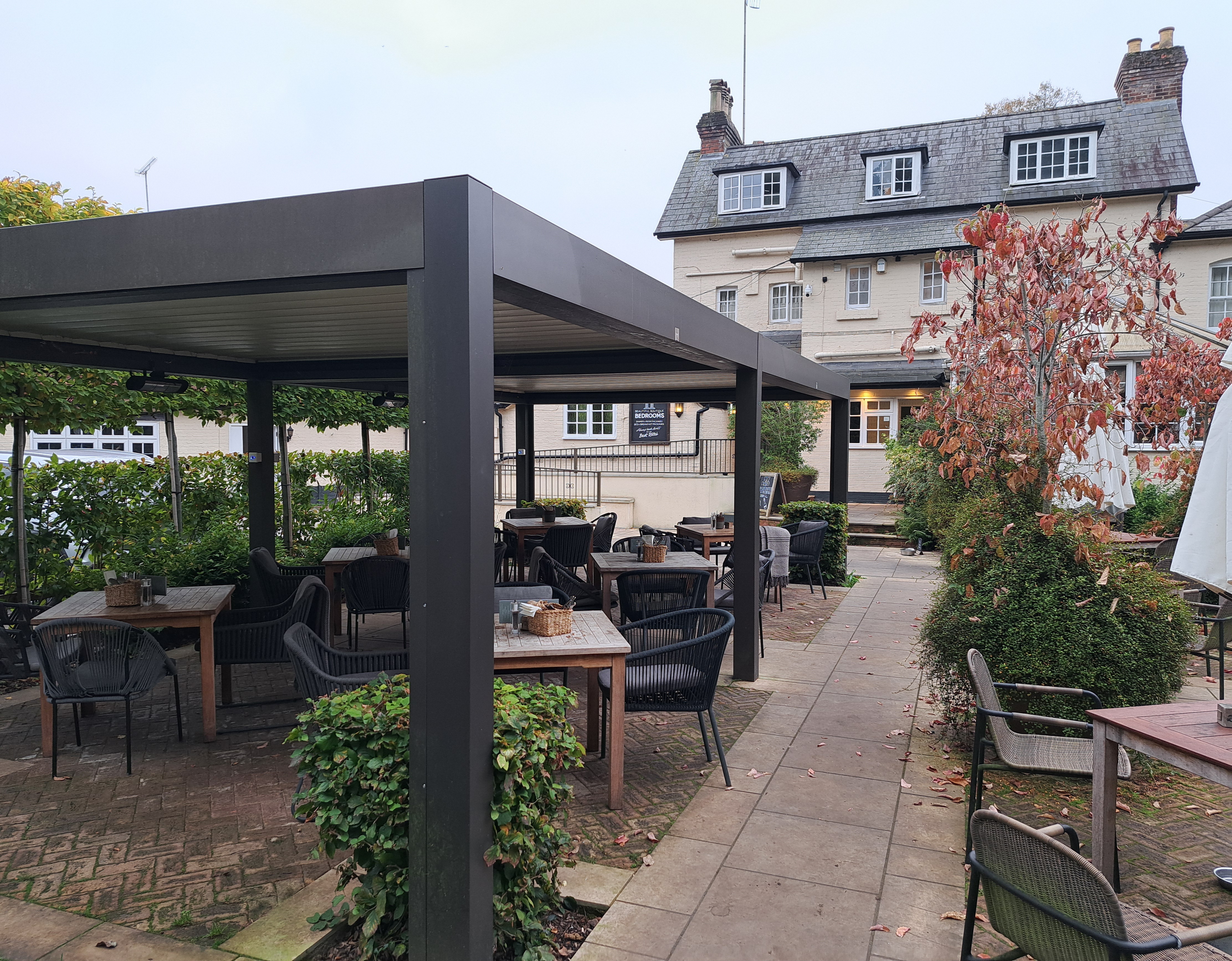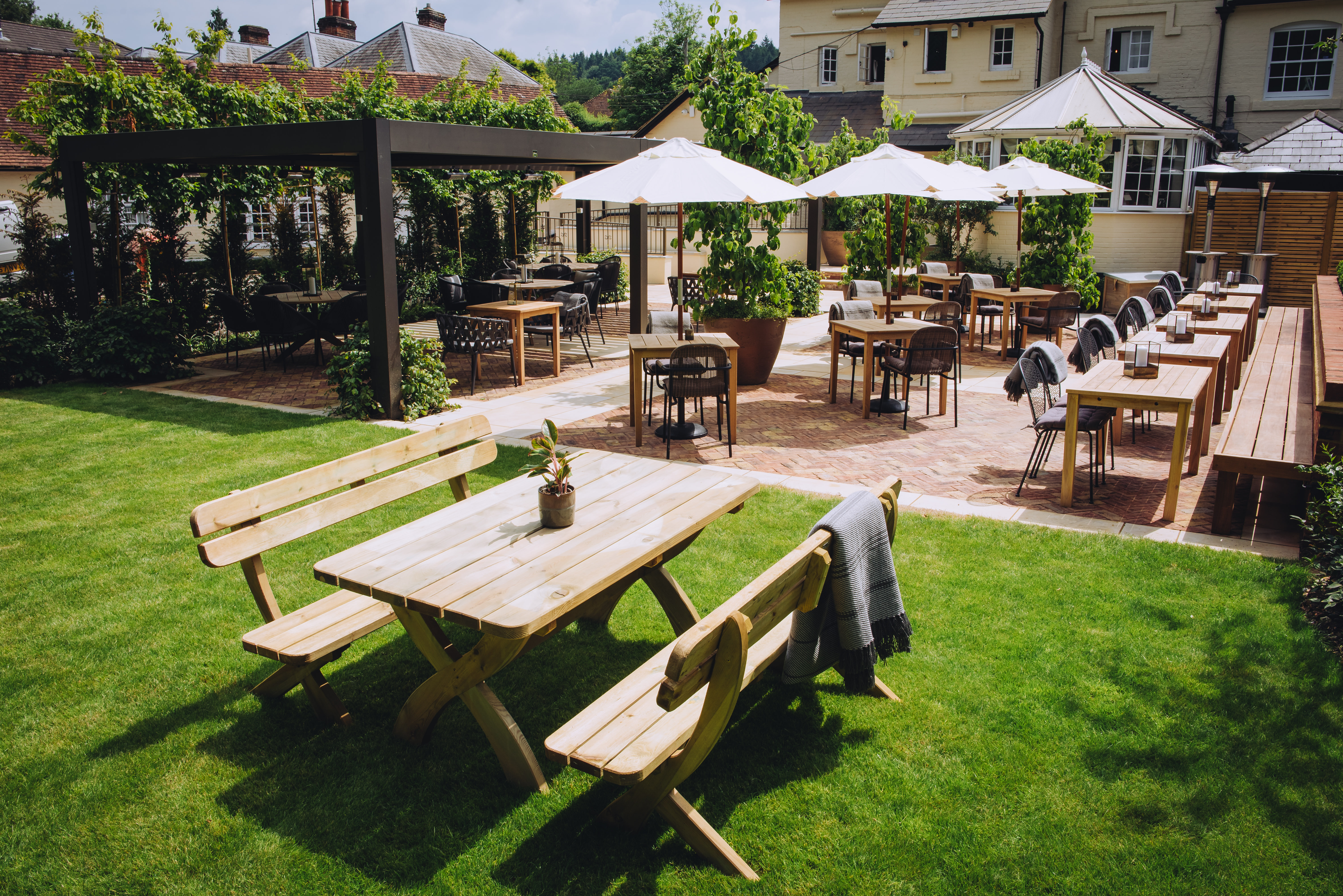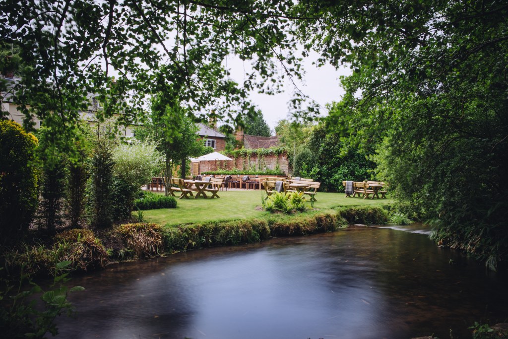 The spacious new patio area, has weathered herringbone, sandstone paving & lawn, which is beautifully planted with well tended plants and furnished with a range of wooden benches, comfortable chairs and tables. I would imagine the small lawn next to the river is very popular on warm sunny days, it is a wonderful place in which to sit and read a book, with a cool drink in your hand or even stretch out on a picnic blanket, by the flowing water. There was also a large wooden covered pergola, to provide some cover from the elements and several large parasols.