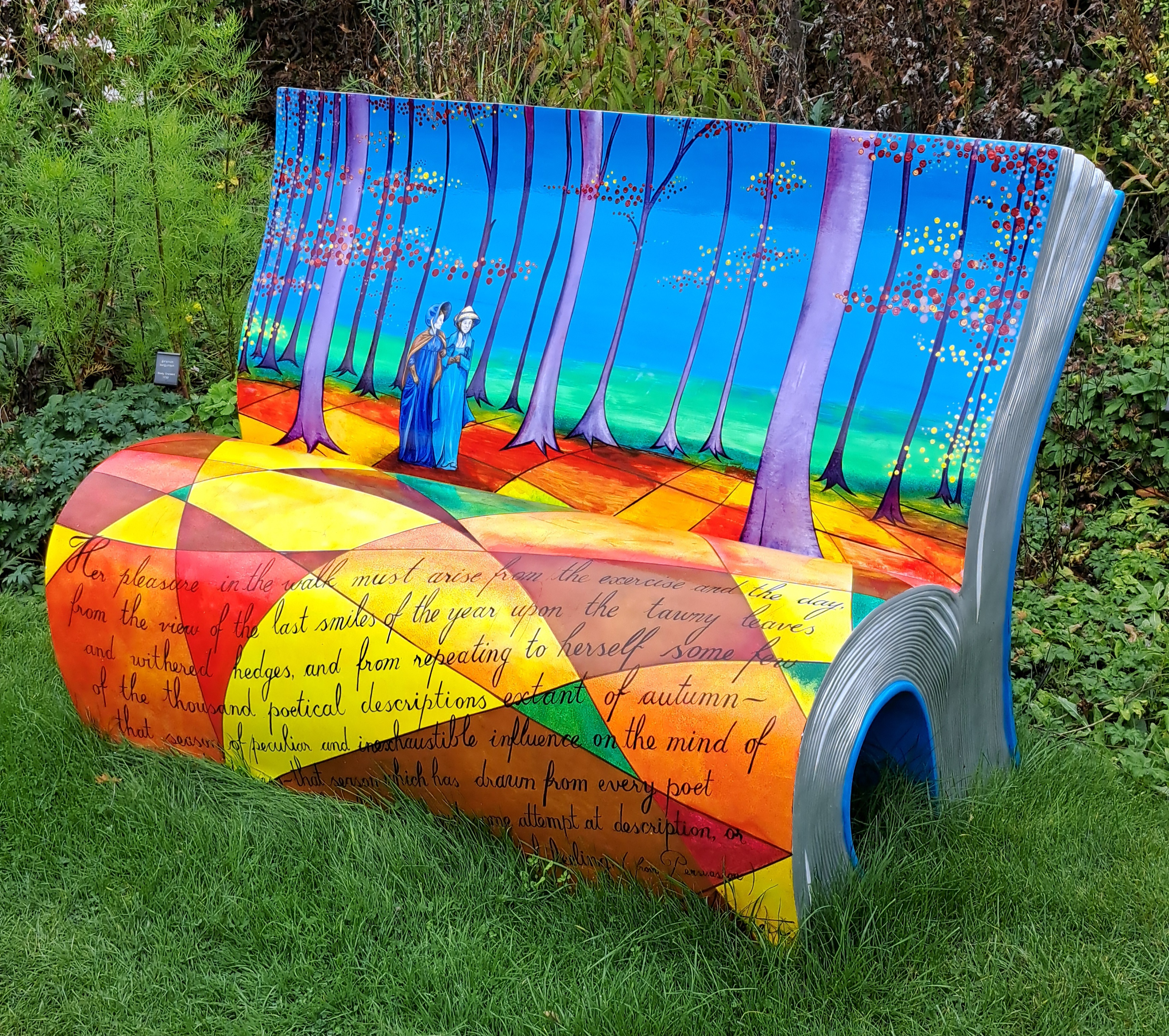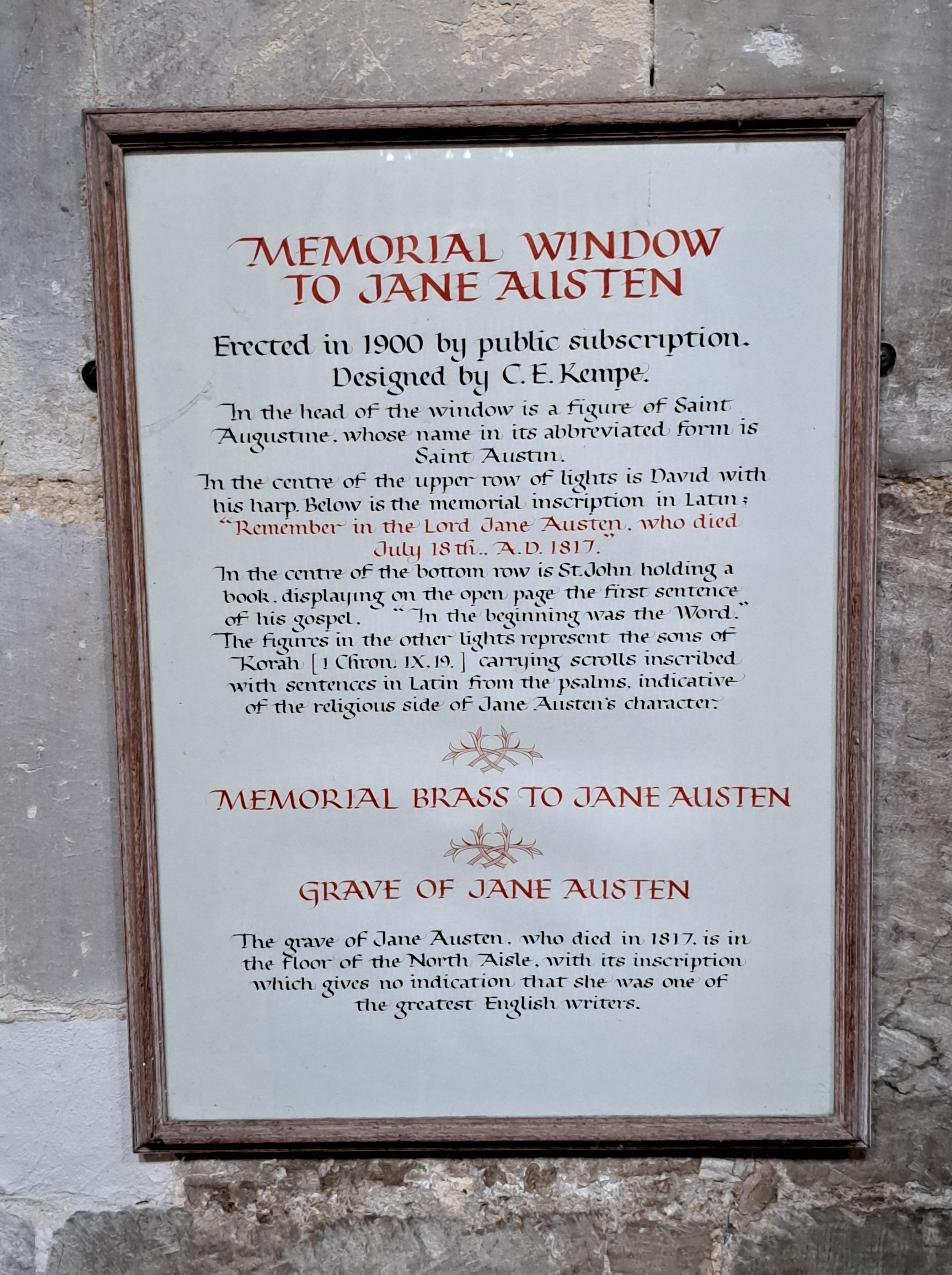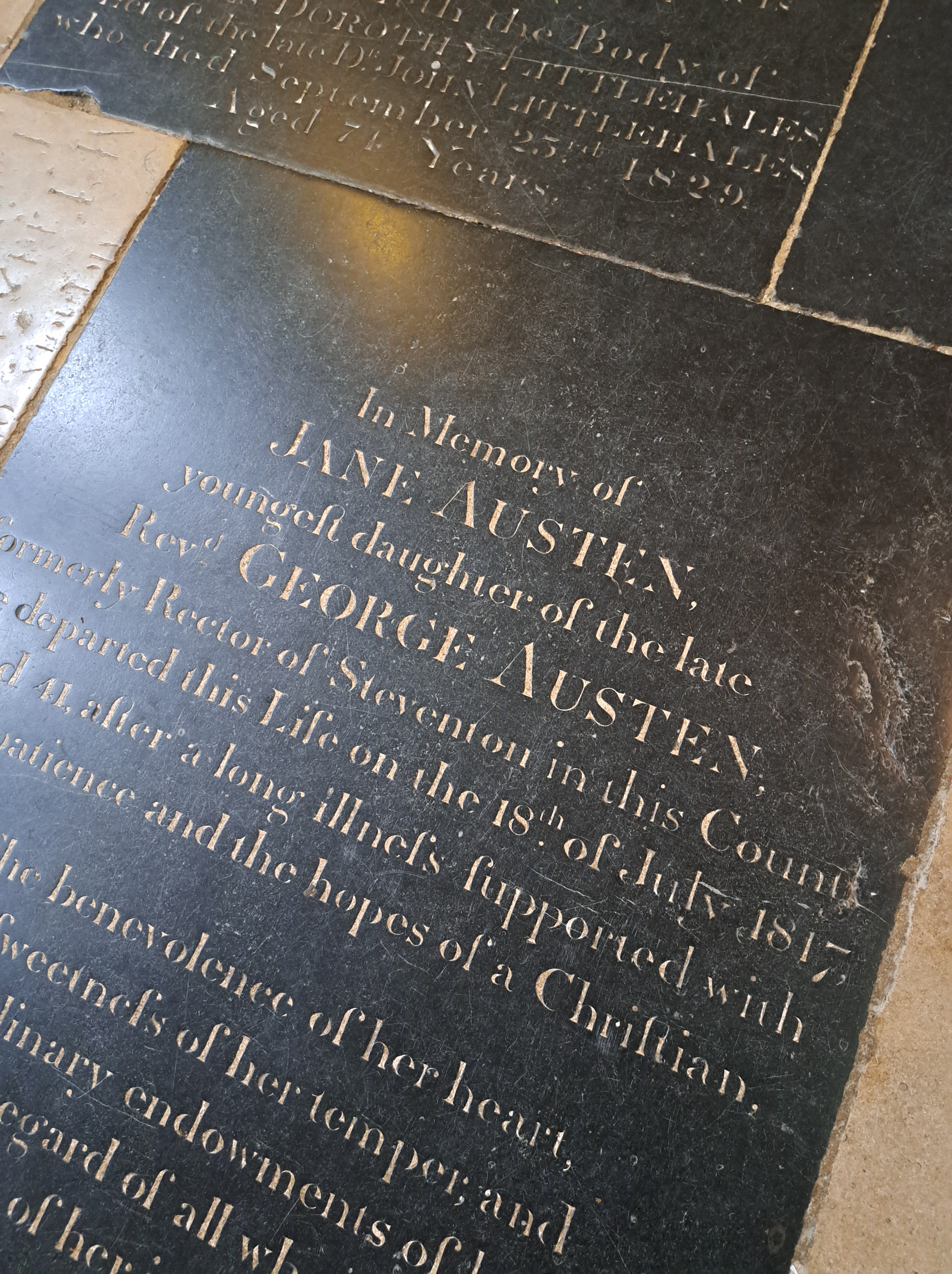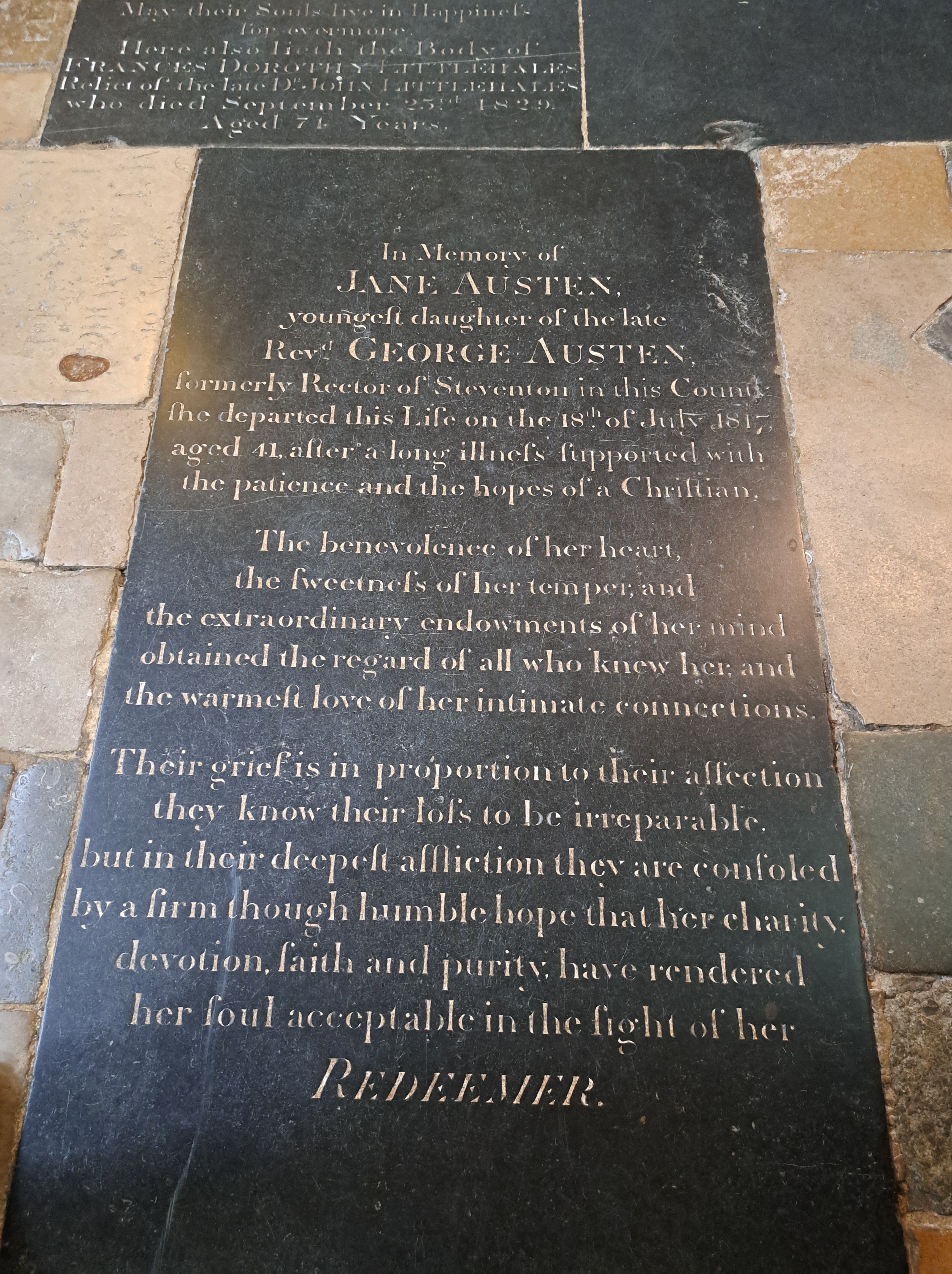 We then made our way over to nearby Winchester Cathedral, which has been a place of worship for over 900 years. Jane was buried in the North aisle of the cathedral, on 24th July 1817, at the age of forty-one. While the tomb inscription makes no reference to her literary achievements, a brass tablet was later added by her nephew Edward, confirming that “Jane Austen, known to many by her writings”. A new Jane Austen statue has recently been unveiled at Winchester Cathedral during the author’s 250th anniversary year. Created by sculptor Martin Jennings, the statue stands in the Inner Close as an elegant figure, with her characteristic ringlets and cap, by her famous writing table.