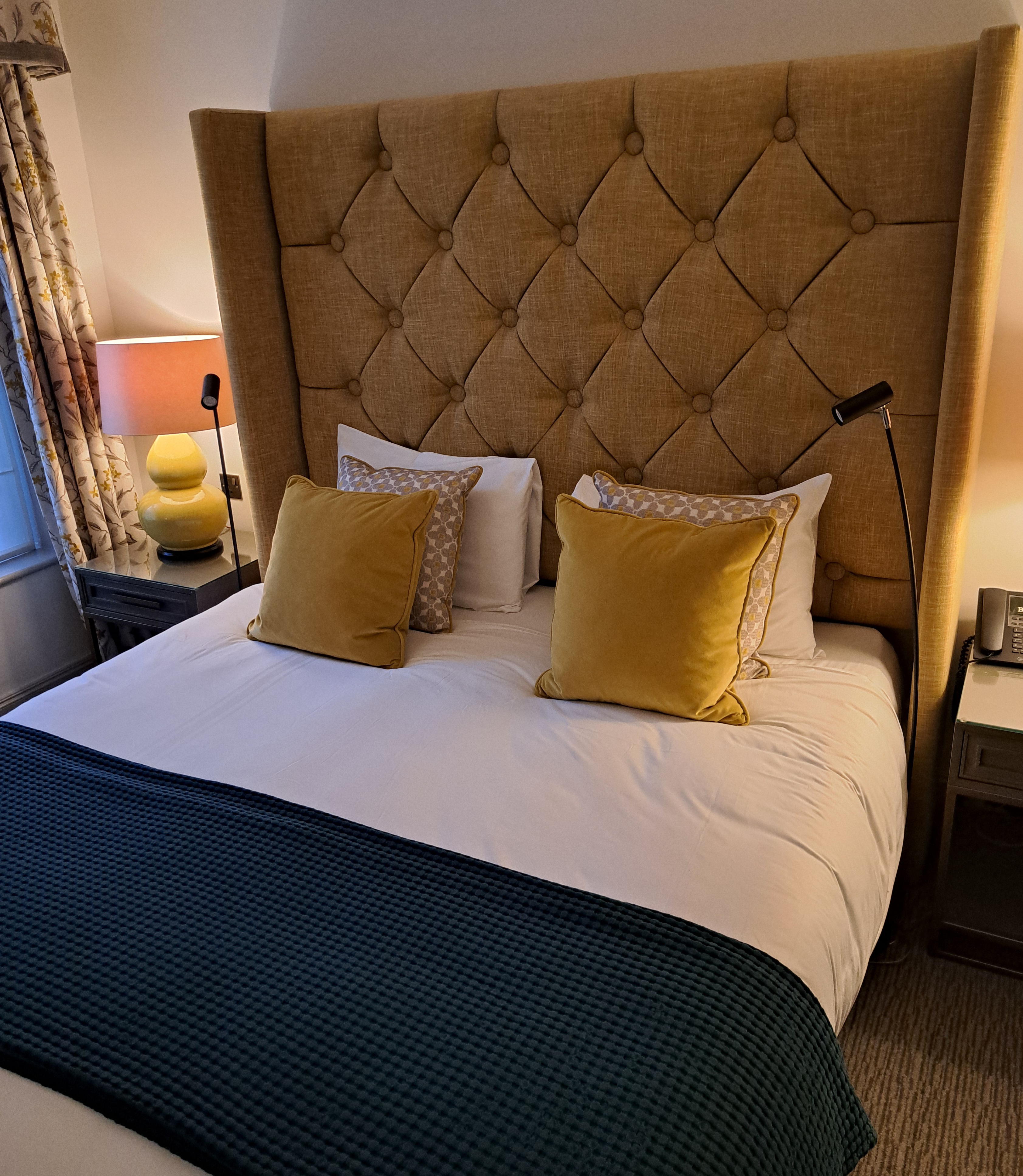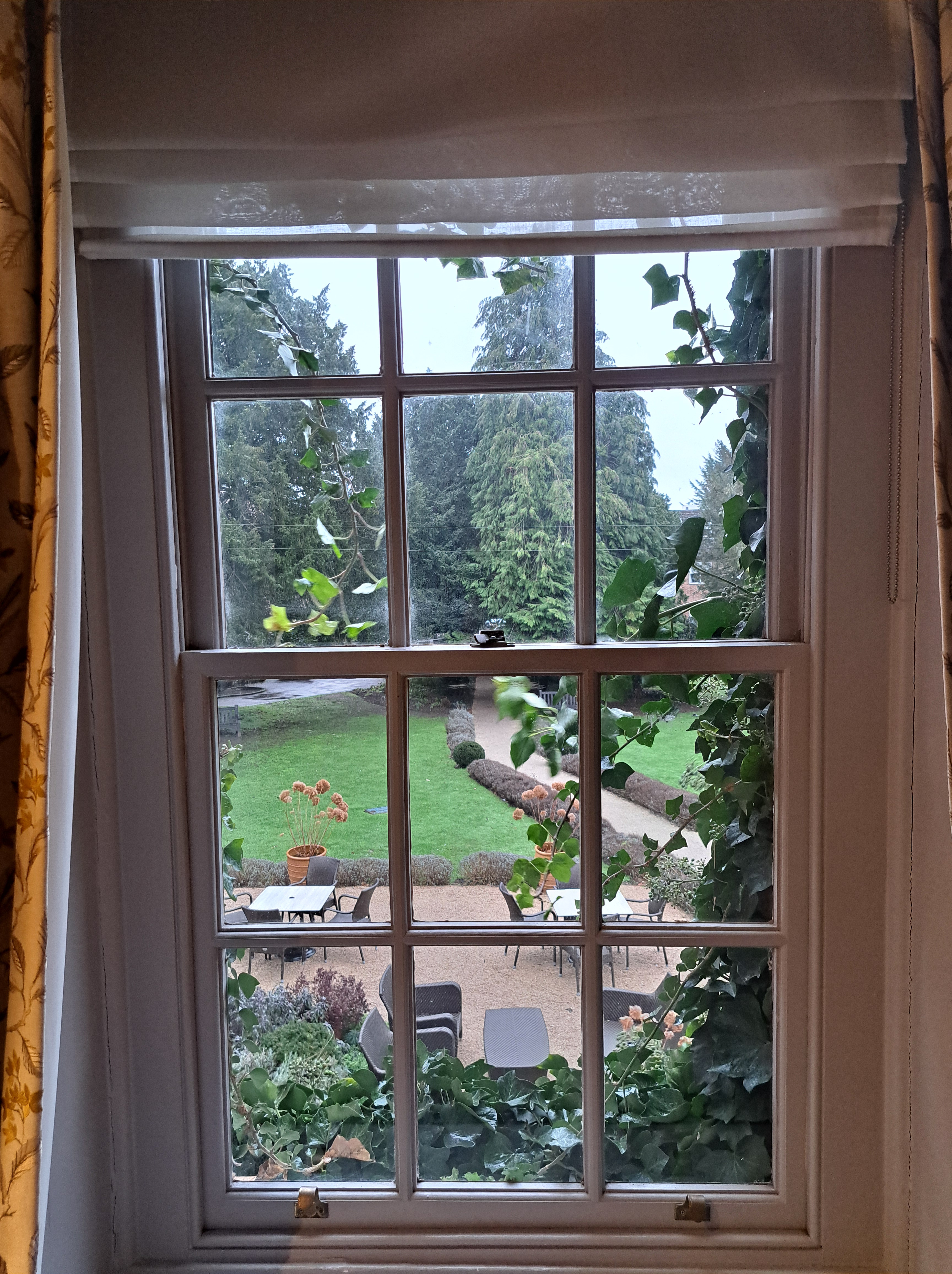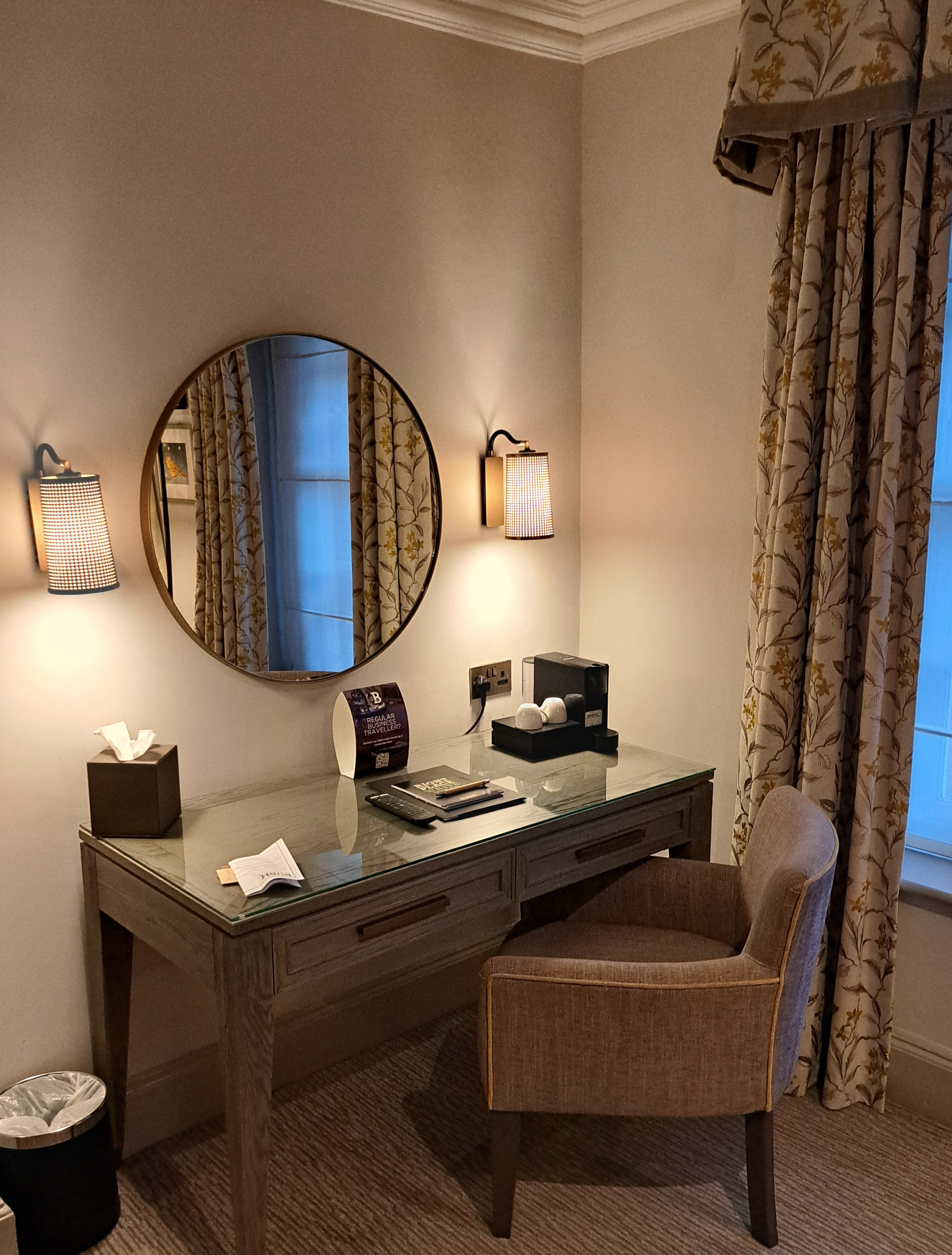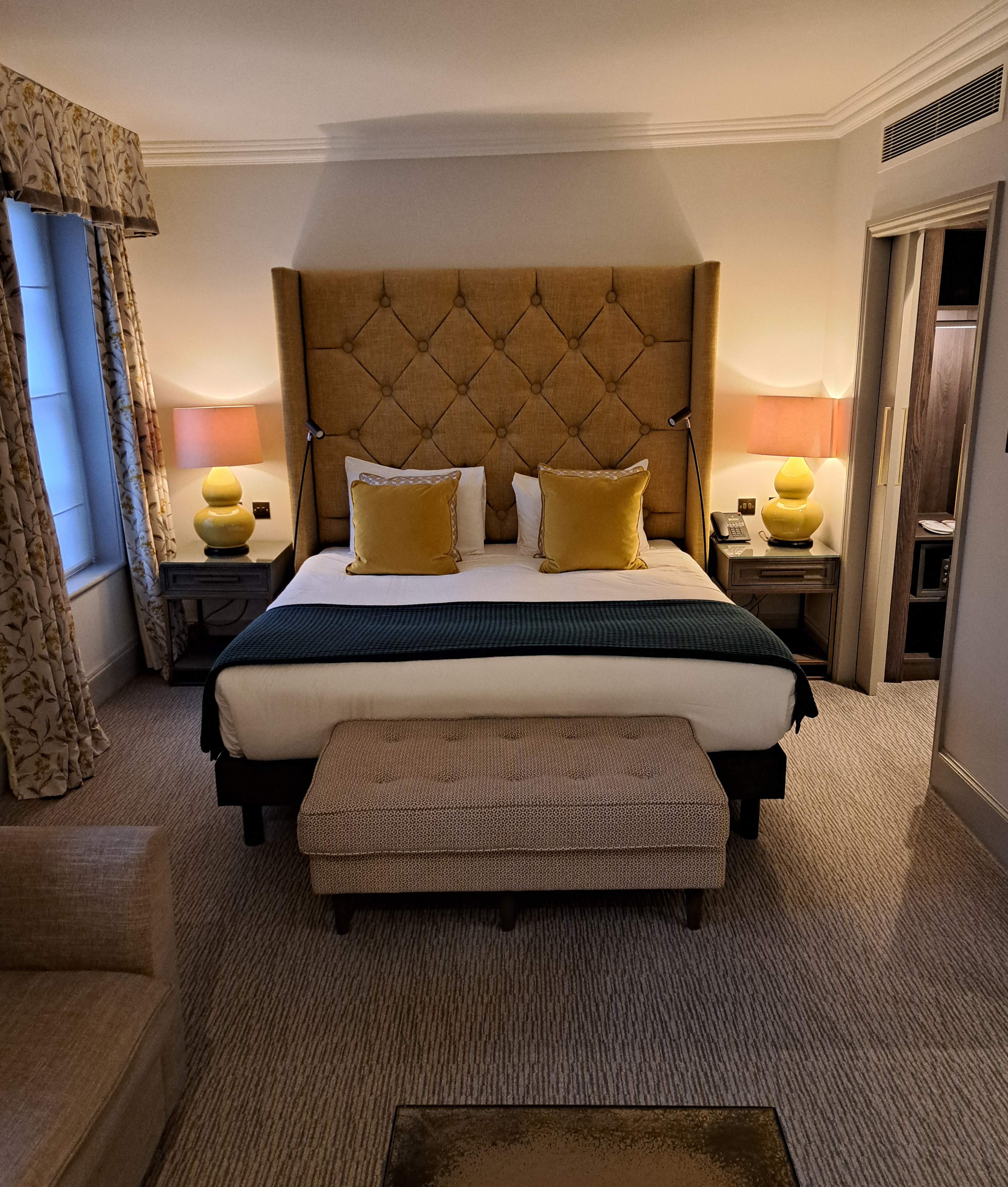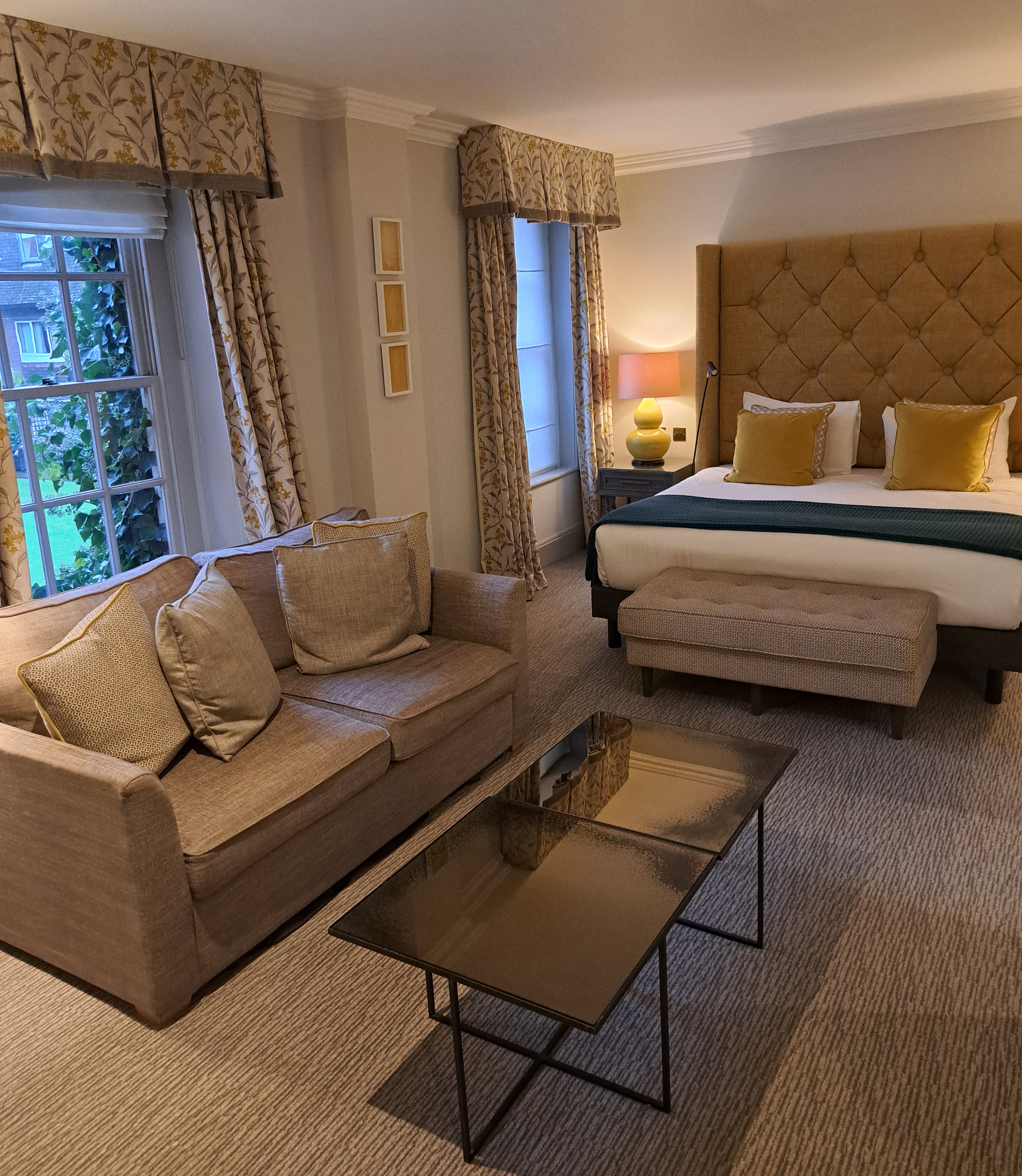 The Bush Suite is where my wife and I stayed. Located in the oldest and most characterful part of the hotel, it was a simply stunning bedroom, with plenty of space and three large windows, through which outside light streamed into the room. You can expect plenty of heritage character with all of the modern comforts, you would expect from a top of the range Hotel. The hotels largest and most grand room came complete with elegant décor, air-conditioning and a dressing room. A huge comfortable King-size bed with luxurious linens, an Ensuite bathroom with walk-in shower and bath, Nespresso coffee machine + tea & coffee facilities with biscuits, Mini fridge, Complimentary mineral water, Flat-screen TV, In-room safe, Iron and ironing board, Hairdryer, Luxury toiletries and Slippers. It was a stunning room, with plenty of space. Having a separate walk in wardrobe, which also included the tea and coffee machines, added a touch of exclusivity. The bedroom windows looked out over the hotels own private gardens.