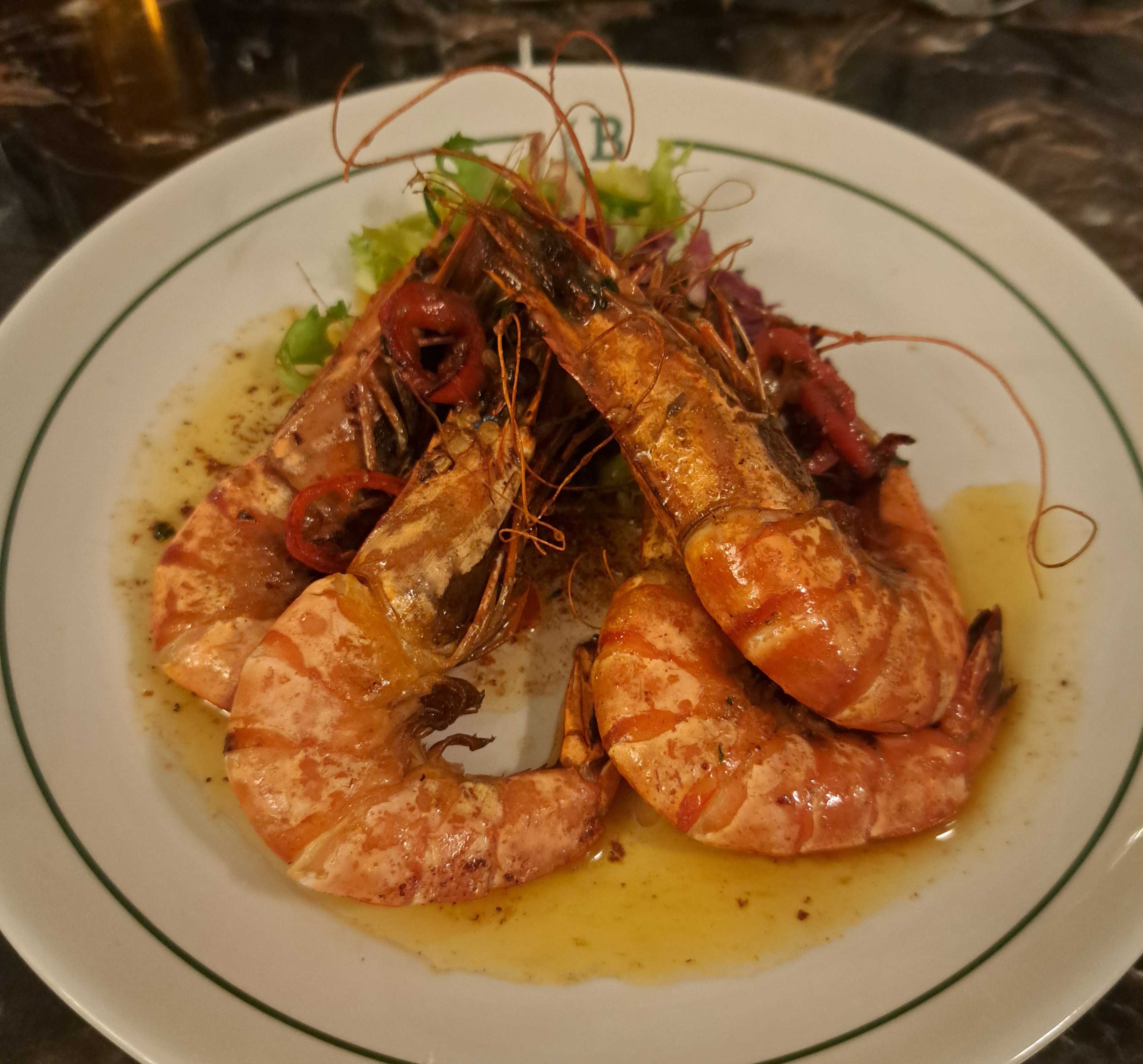 Shell on Prawns, cooked in chilli, lemon & garlic butter. – I was given a small bowl of water to clean up my fingers after eating the four beautifully cooked, hot chilli prawns. they were absolutely delicious.