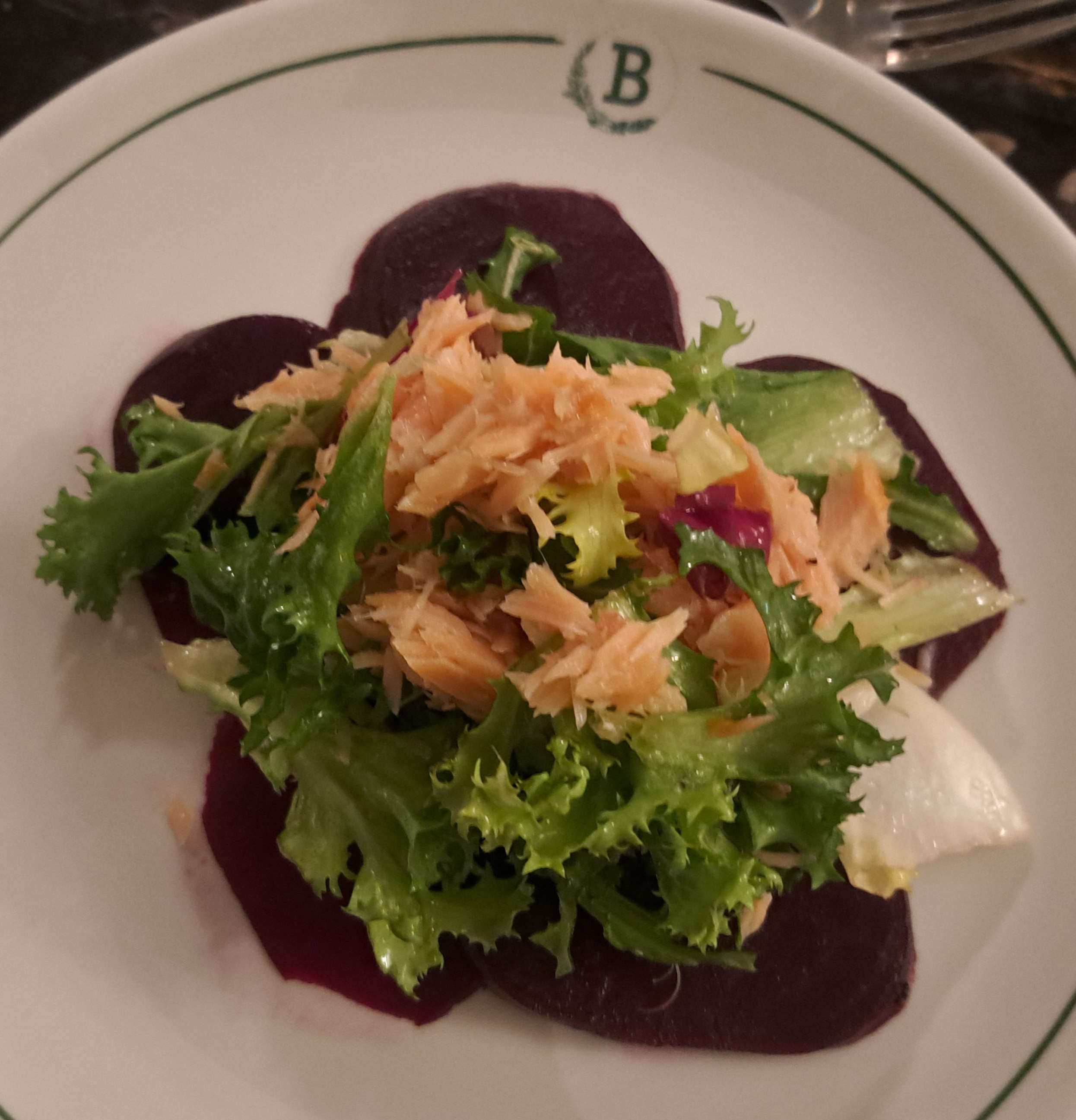 Hot smoked salmon & beetroot salad, crisp leaves & horseradish dressing. – artistically presented beetroot. My wife described her starter as a refreshing and light starter. It was just what she wanted.