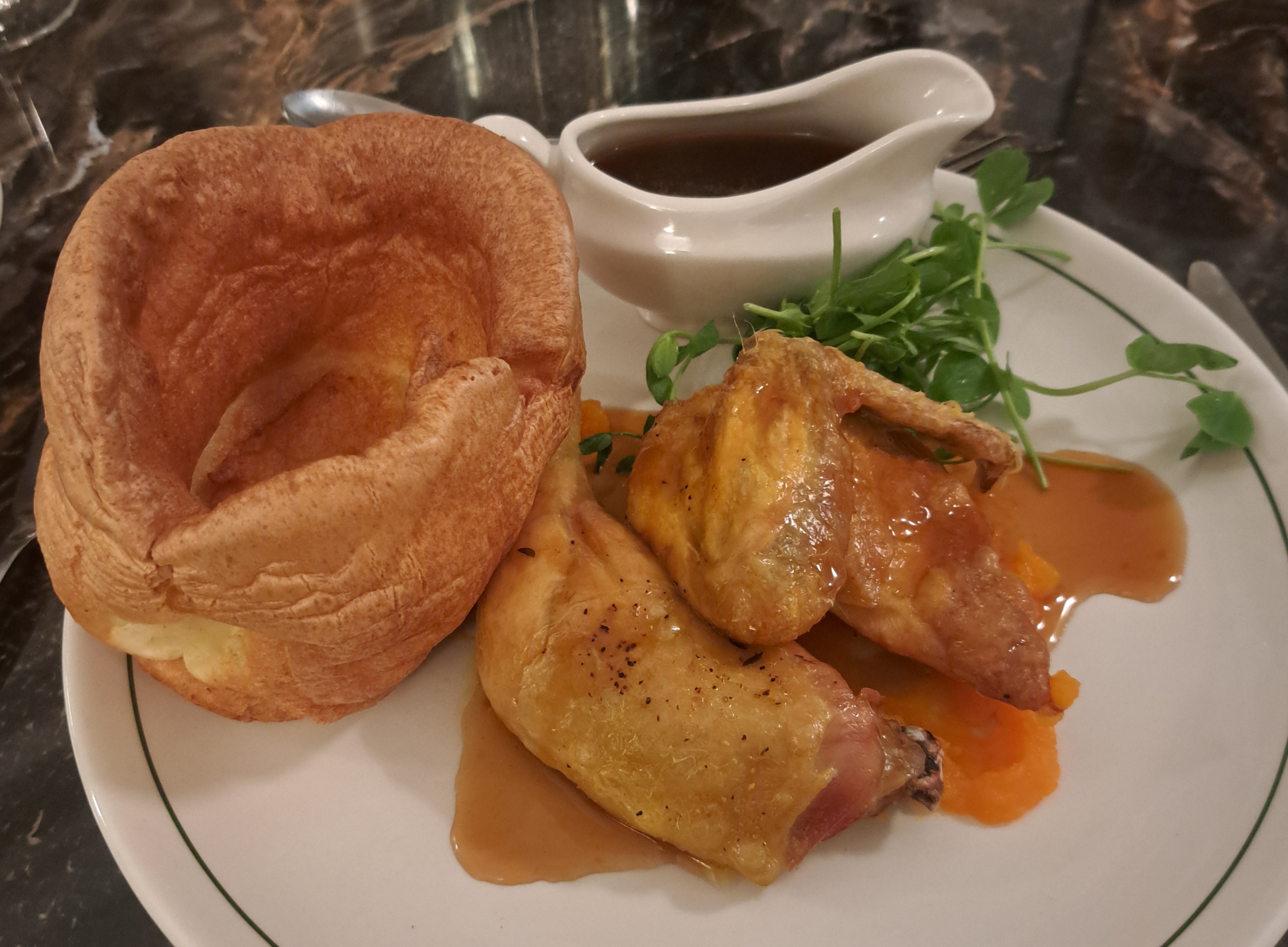 Half Roasted Corn Fed Chicken, Yorkshire Pudding and a Butternut Squash Puree. – crispy skin, a small pot of rich hot gravy, large Yorkshire pudding, roast potatoes, parsnips and carrots. A perfectly cooked chicken with all of the trimmings, the perfect meal for a Sunday!