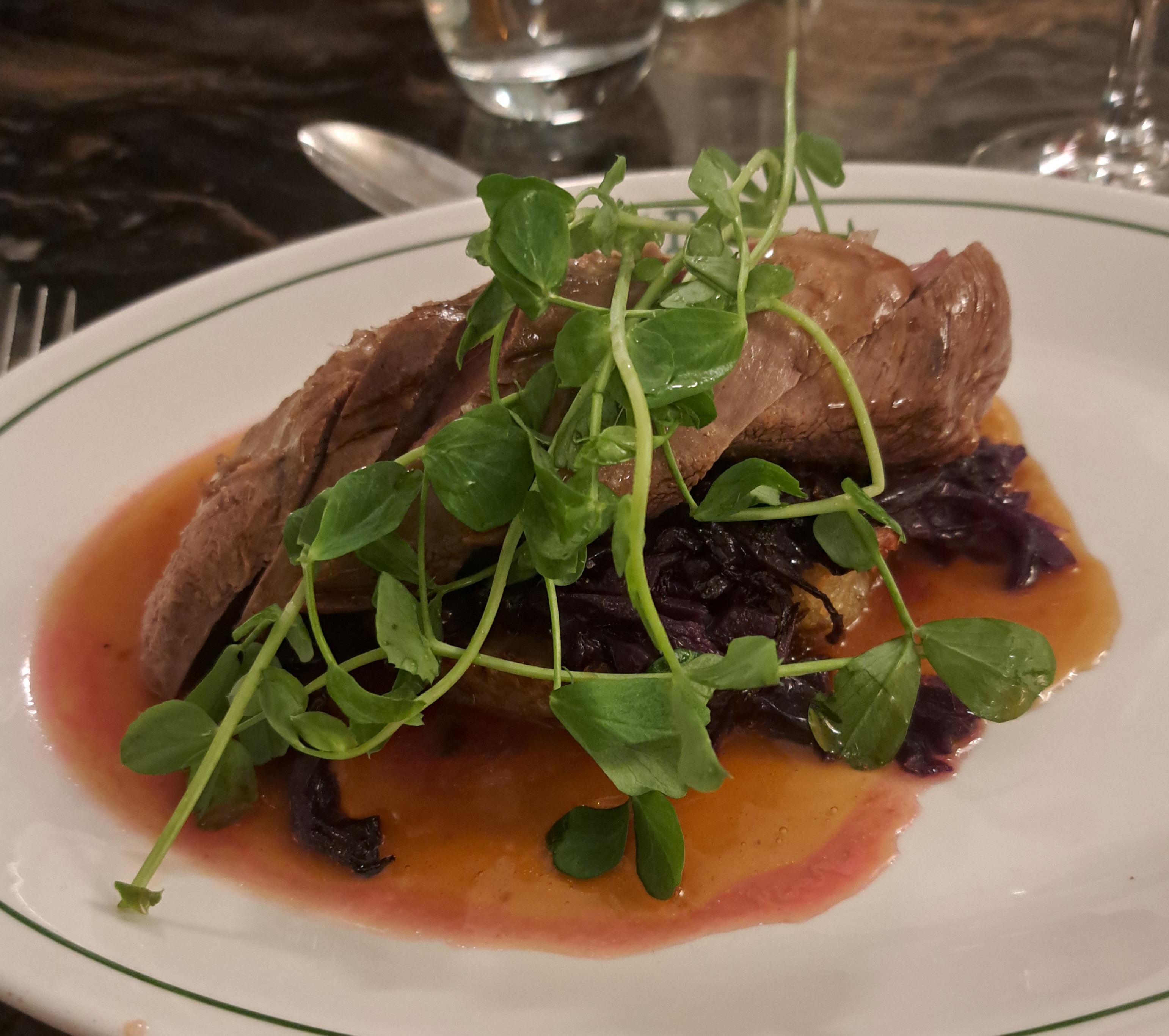 Seared Duck Breast, Braised Red Cabbage, Potato Rosti with a rich cherry jus. A crisp golden skin and a rich gamey flavour and a little pink flesh. Beautifully cooked, pan seared and oven finished duck breast, accompanied with a rich cherry jus. Simply perfect!