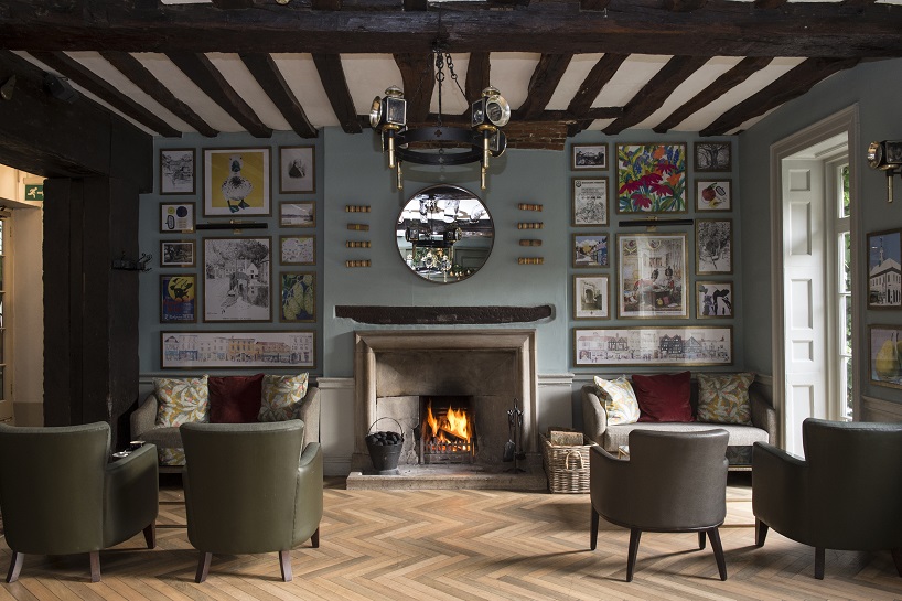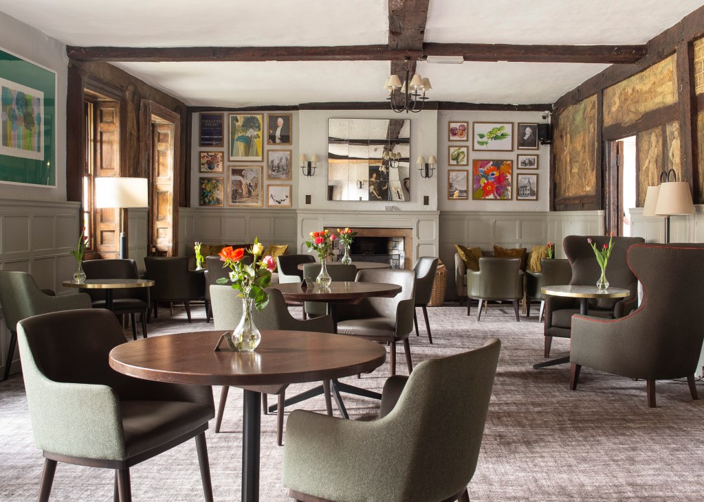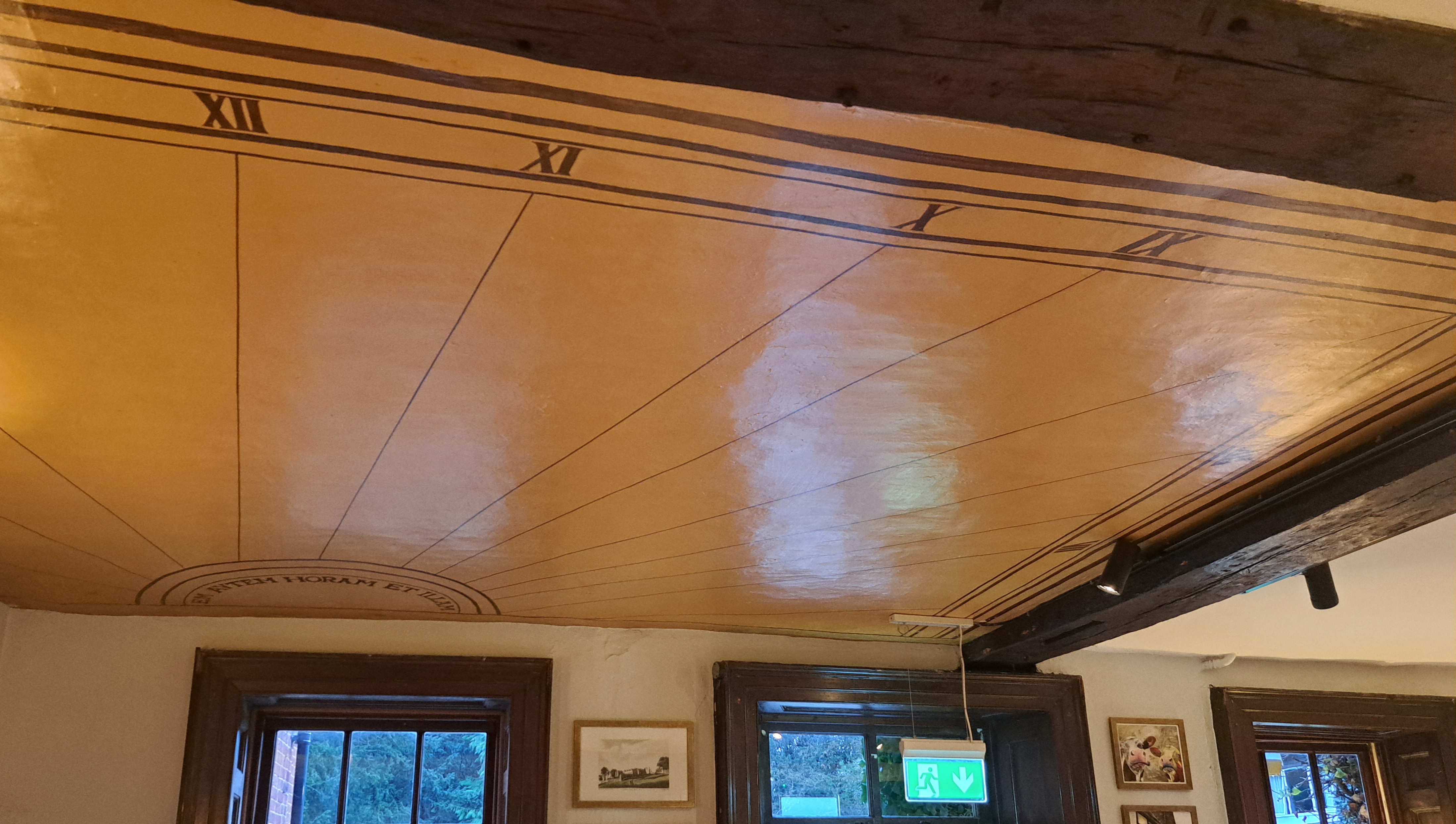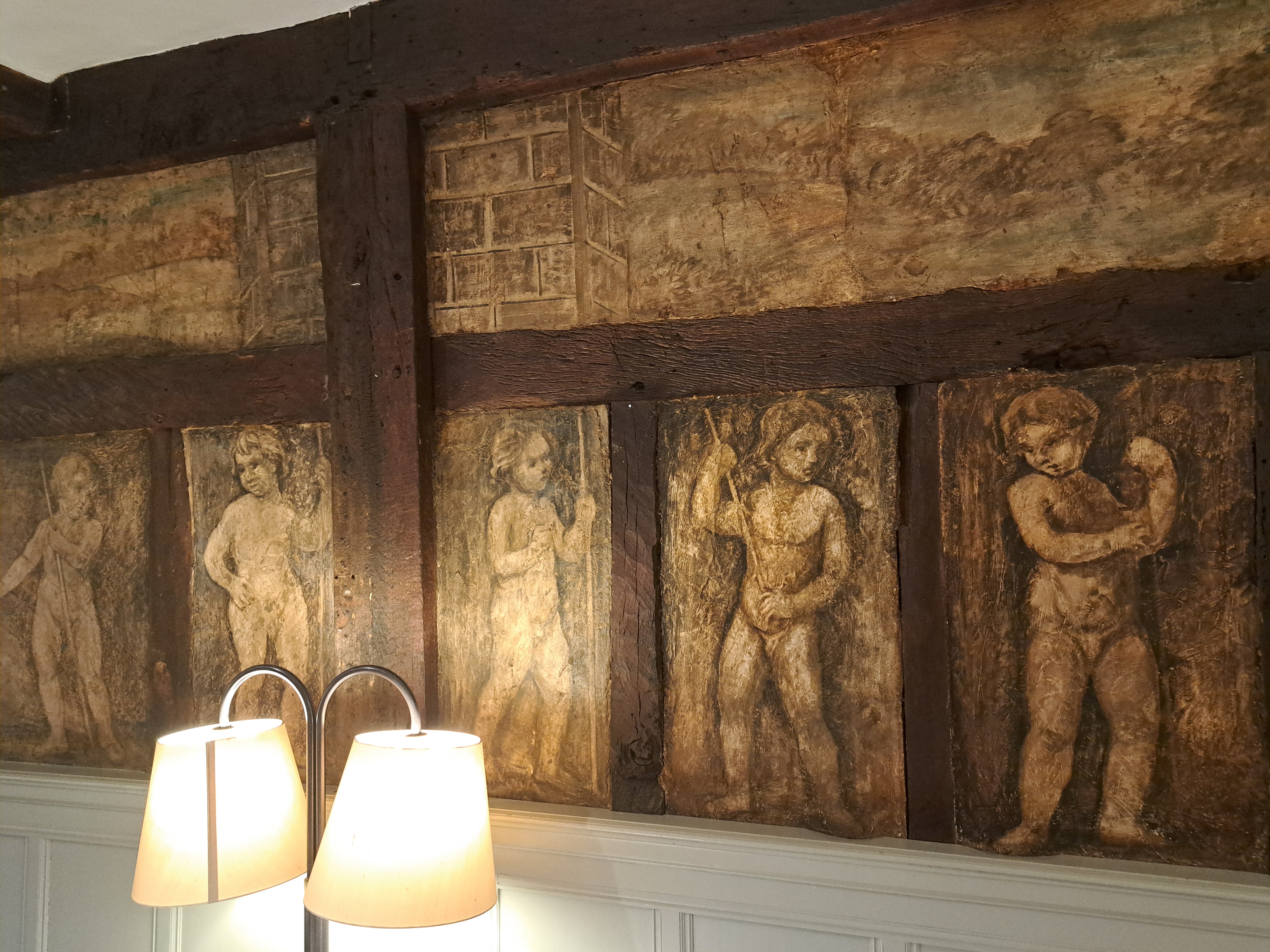 The Oak Lounge is an original part of the hotel with original exposed oak beams. A large number of painted wall frescoes were discovered in 1931, during extensive hotel renovations. They had been whitewashed during the Victorian era, because the naked cherubs had been considered too rude for public absorption, at the time! A painted sun dial on the ceiling of the Oak lounge had previously been discovered 44 years earlier in 1887. Both the frescoes and the sun dial can still be seen by guests today.
